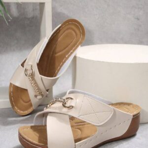 รองเท้ารัดส้นสีขาว ส้นสูง 2 นิ้ว พื้นไม้ก๊อก สไตล์หวาน
