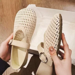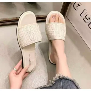 รองเท้าแฟชั้นส้นแบน ผ้าสานน่ารัก สีขาว ปักคำ