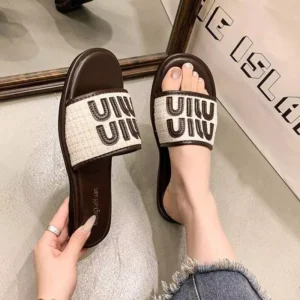 รองเท้าแฟชั้นส้นแบน ผ้าสานน่ารัก สีน้ำตาล ปักคำ