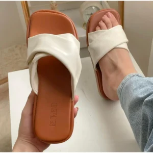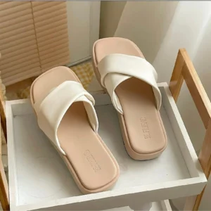 รองเท้าแฟชั่น สายหนังเส้นไขว้ สีน้ำตาล-ขาว
