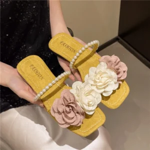 รองเท้าแฟชั่นส้นแบนสีเหลือง แต่งดอกไม้น่ารัก