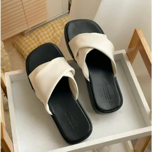 รองเท้าแฟชั่นส้นแบนสีครีมคาดขาว