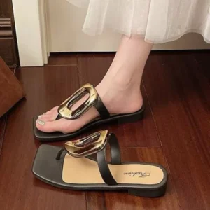 รองเท้าแฟชั่นส้นแบนสีดำคาดสาย แต่งทอง